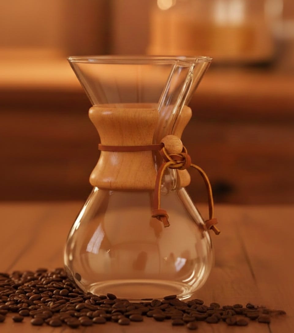 Mais do que uma cafeteira, uma obra de arte na sua bancada. A Chemex é mundialmente reconhecida por seu design atemporal em vidro borossilicato e seu colar de madeira natural com laço de couro.